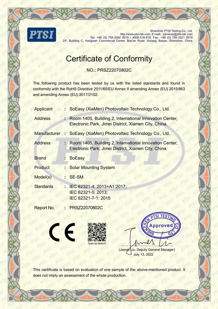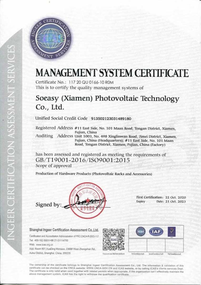As a professional manufacturer of solar mounting systems with independent R&D capabilities, SOEASY Solar builds a full-range international certification matrix to deliver unwavering professionalism, strict quality assurance and full compliance for global B2B distributors, EPC contractors and large-scale solar project developers.