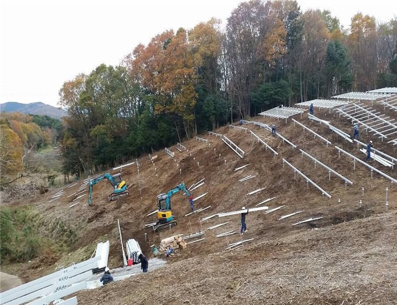 由于日本以山地地形为主,适合大规模太阳能建设的平地资源有限,因此山地斜坡式太阳能项目日益普及。该项目位于林地边缘的山坡上,光照资源丰富,是可再生能源开发的理想地点。